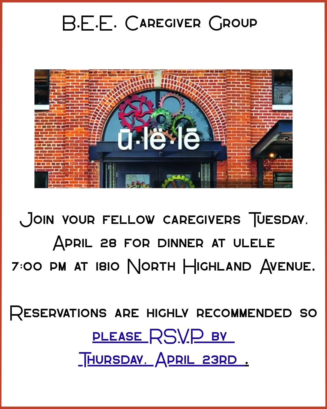 We are switching things up a bit. Instead of B.E.E. Caregiver's restaurant night, we are having a Mindfulness Retreat for all you. This will be a soothing, relaxing afternoon of self reflection! Come pamper yourself in some guilt free "me" time! Date: March 8, 2026 Time: 3:00pm - 5:00pm Where: The George Residence […]